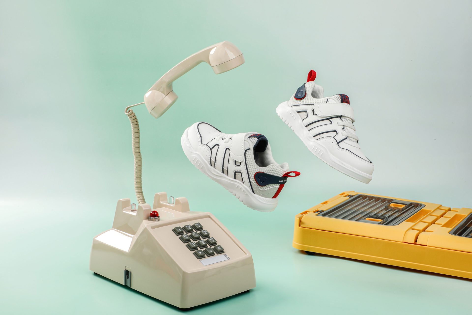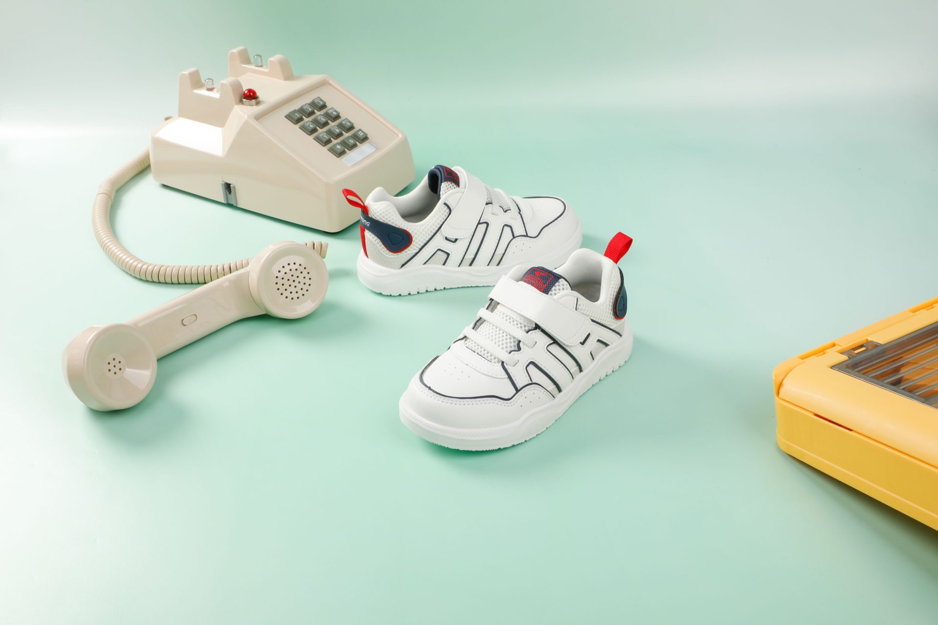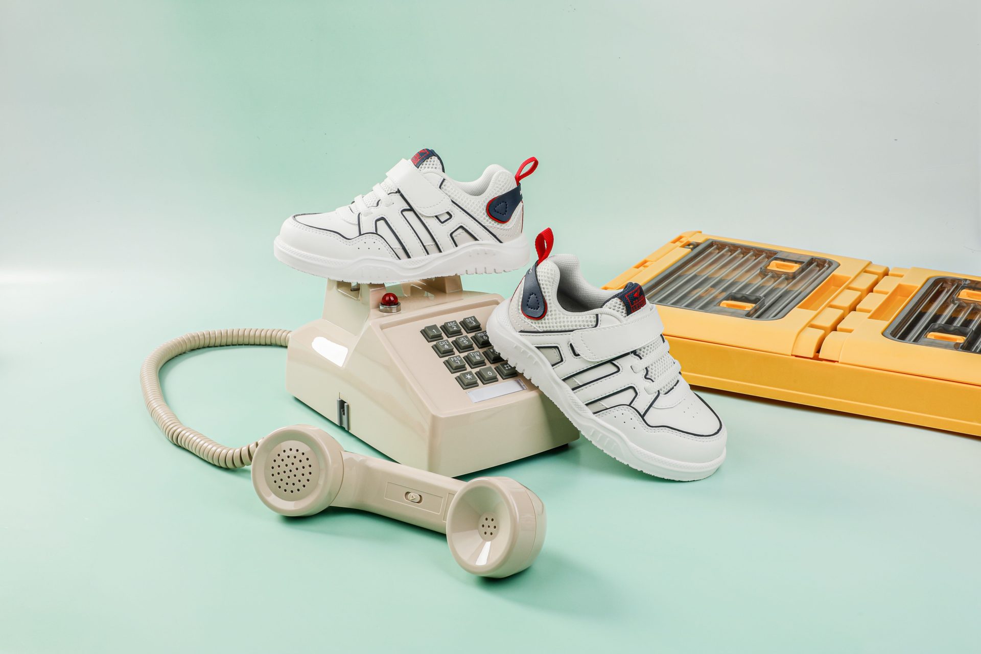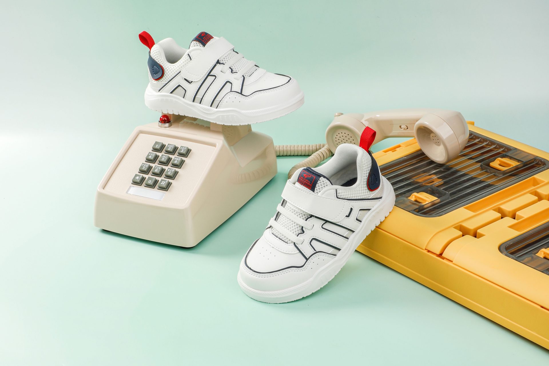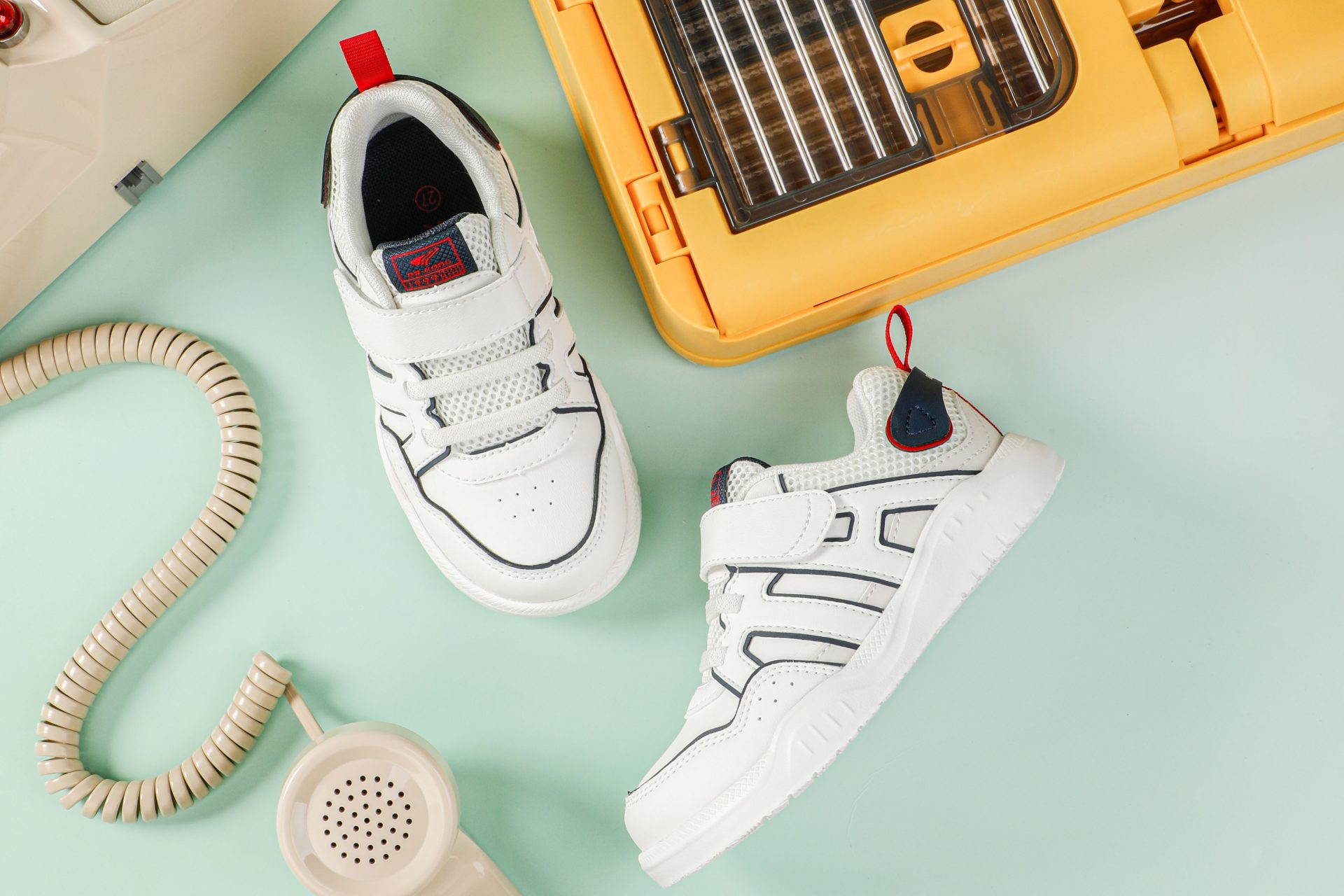 White sneakers with navy and red accents